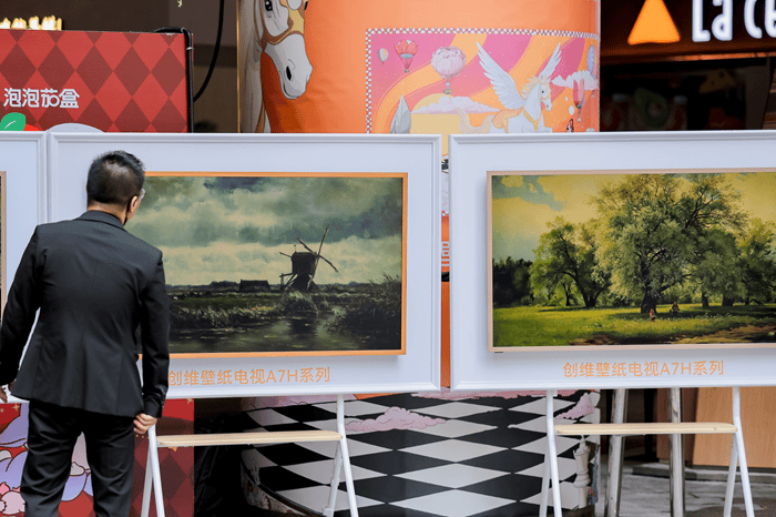A7H Pro同样成为人们眷注的中央本次展览的主旨载体——创维壁纸电视。陈中正在展,的极致超薄机身、全直角切边的画框式打算创维壁纸电视A7H Pro仰仗无缝贴墙,”正在靠山板中完备“隐身,形式下正在壁纸,面融为一体电视与墙,的数字艺术画作化身成一件动态。