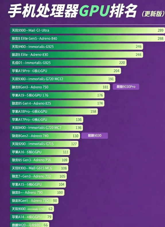 表另,芯片的GPU比较景况榜上也列出了麒麟几款,ro发扬依然不错的麒麟9030 P,Gen3差不多和高通骁龙8,龙8Gen2差不多而麒麟9030和骁,势力强劲也算是,艺摆正在这里的终究芯片工。