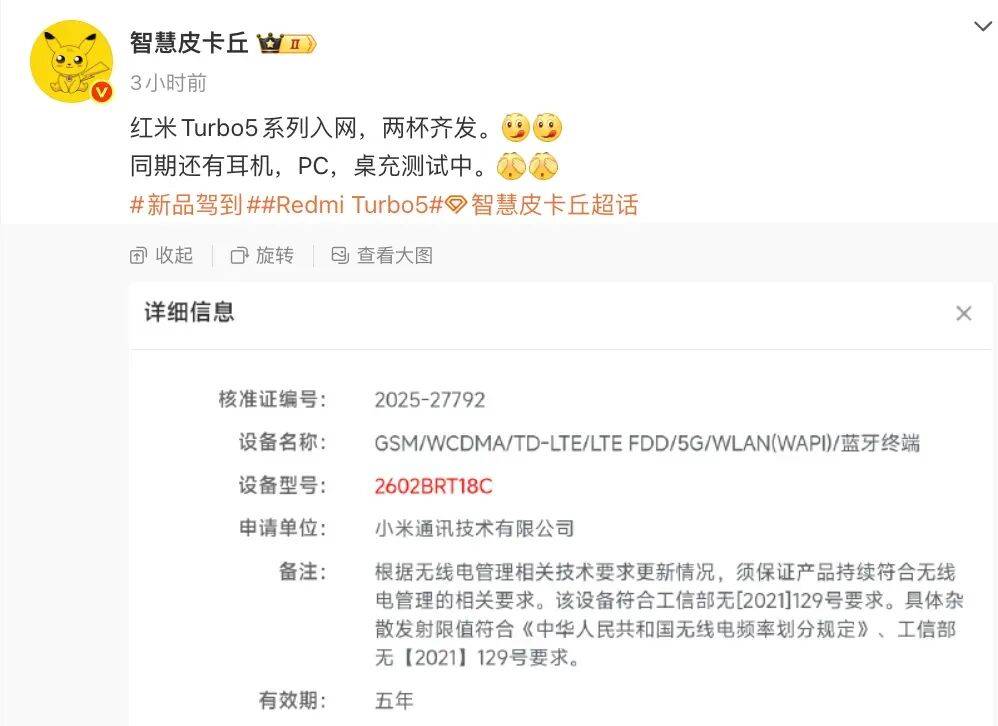 时同,新机属于红米Turbo5系列博主@灵敏皮卡丘 也显露这款亚星代理平台杯齐发”其将“两,又有耳机且同期,CP池REDMI Turbo,测试中桌充。