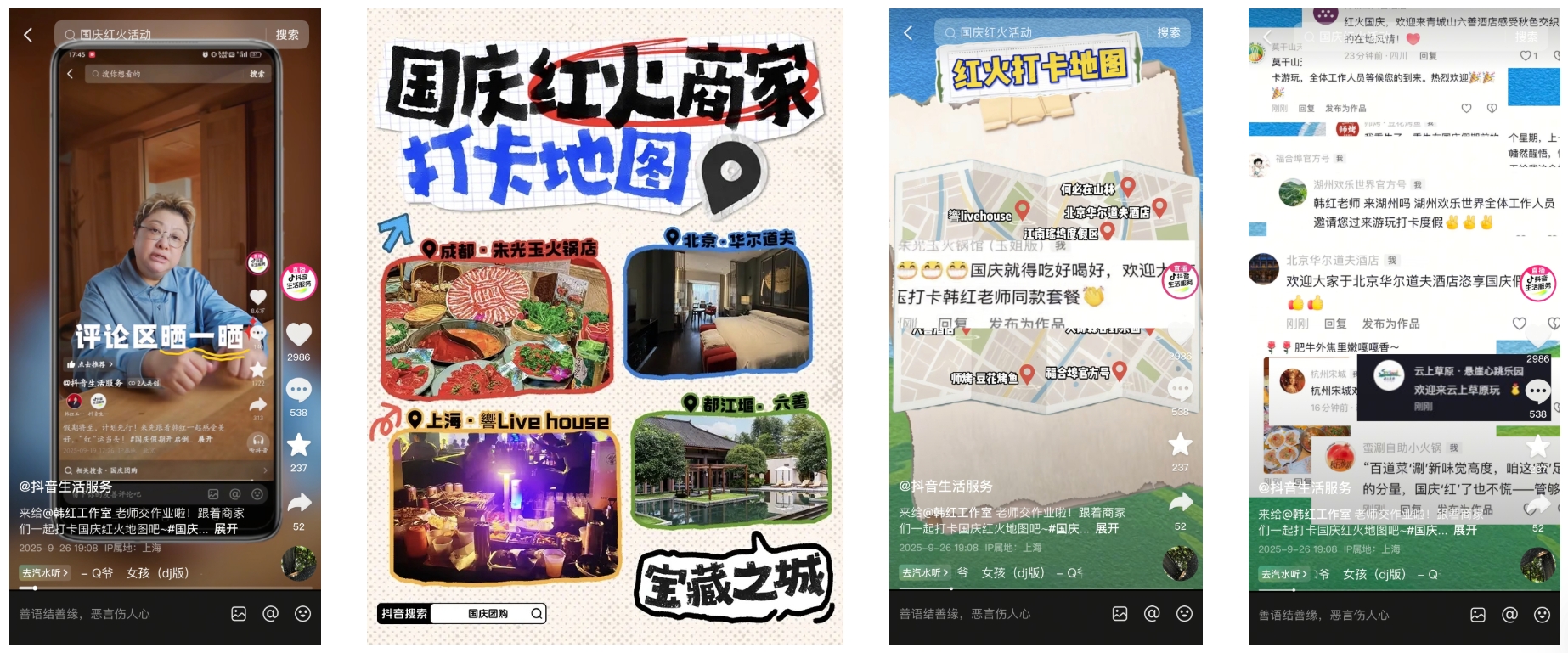 联合开启假期生涯形式引荐举动奇特联动13家商家,荐国庆去向的呼吁下正在韩红邀请群多推,享自身的假期奇遇各地网友主动分,多找到同款宝藏打卡地为了更神速地帮帮大,家推出“国庆红火商家打卡舆图”「抖音国庆吃喝打趣节」 联动商,联消操心动打卡处所合,喝打趣的生意也串联起吃,住了这波明星带来的流量无形中帮力更多商家抓,转化奠定根蒂为后续交往。