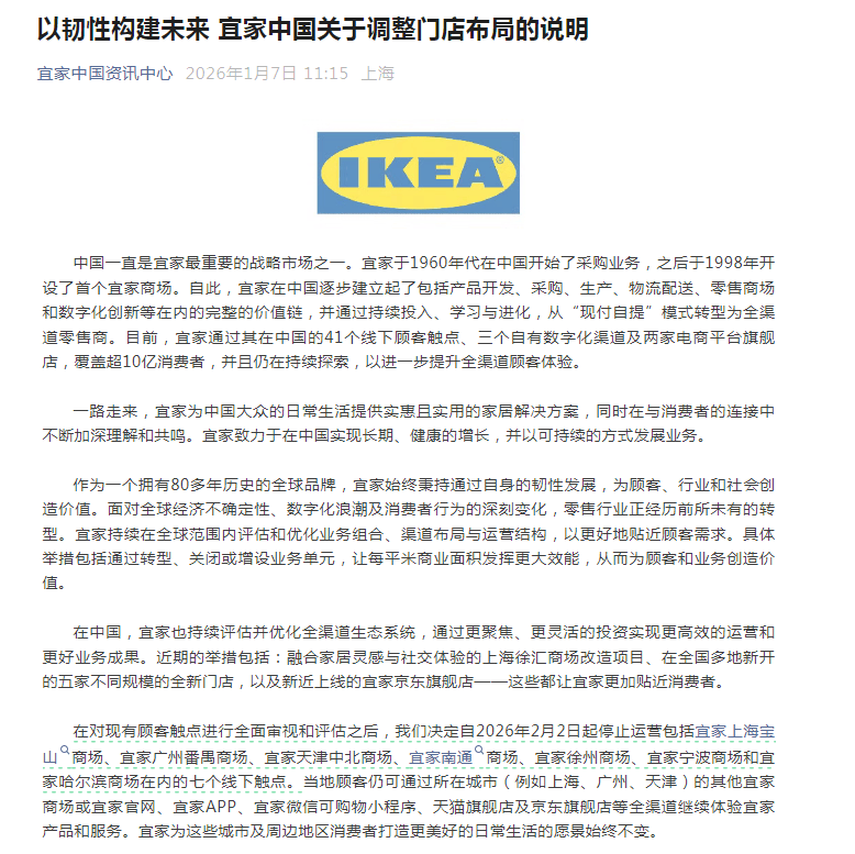 7日1月,日起闭塞7家线下门店宜家中国揭晓2月2,店同步启动闭店过渡期宁波、广州番禺等门,日暂停交易后1月7日至8亚星代理平台业并启动清仓举动将于9日复原营。